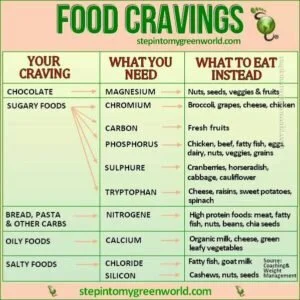 For instance, an insane craving for chocolate often signals a magnesium deficiency. Nuts and seeds, avocados, bananas, and leafy greens are all high in magnesium, or you can add a modest magnesium supplement to your diet. You will be amazed at how your interest in chocolate will wane. You can also experience sugar cravings if you are low in the nutrients chromium, tryptophan, carbon, phosphorus or sulfur. The chart at right gives you some ideas of what to eat instead.